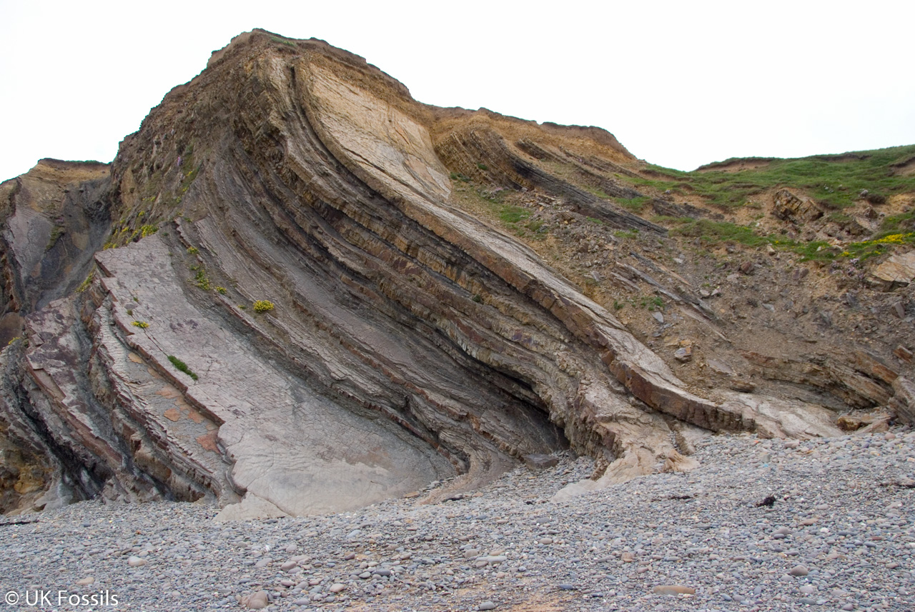The folded sandstone and shale beds exposed so wonderfully in the cliffs in and around Bude belong to the Bude Formation of Silesian (Upper Carboniferous) age (~310 mya ) which is from the Westphalian Stages (Langsettian to Bolsovian).