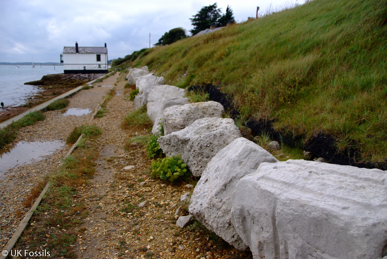 Also of interest are large sea defence rocks along the footpath and on the foreshore, just past the car park. These consist of Bembridge Limestone, Purbeck Stone and Carboniferous Limestone. At the eastern end of the car park, an Ipswichian interglacial deposit yields elephant remains, exposed on the foreshore as a black, peaty bed.